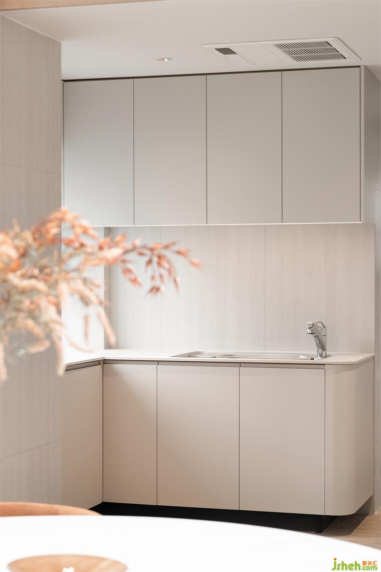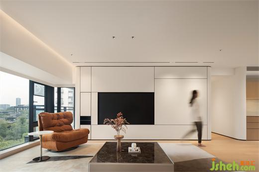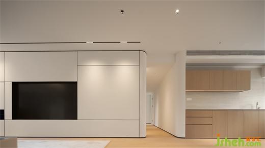 低飽和基調(diào)自帶淡雅的高級感,一抹橙褐色仿佛是玉蘭花蕊,高雅清新且富有生命力 。電視背景墻的設(shè)計是在結(jié)合功能需求后,家裝設(shè)計以勾縫分割的手法創(chuàng)造出大小不同的體塊,比例協(xié)調(diào)不失美感;走廊泛照明撇棄以往天花燈槽的做法,簡化造型,豎向補光。在光的映襯下,空間設(shè)計手法顯得十分克制卻不失豐富的細節(jié)考量。