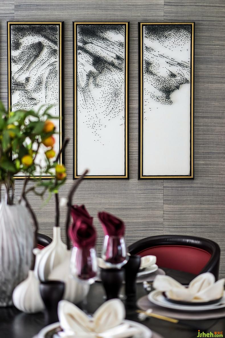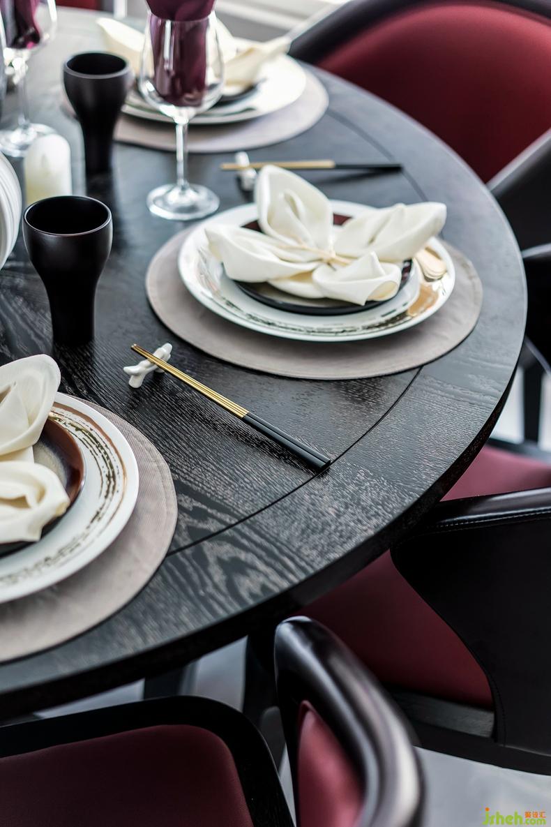 在這套260㎡的居所中,設(shè)計(jì)師采用直接而干練的線條,自由放松的尺度,是對(duì)應(yīng)空間最貼切的詮釋。餐具的清雅自然、中國紅的深邃蜿蜒,猶如在山水之間,意境之中。