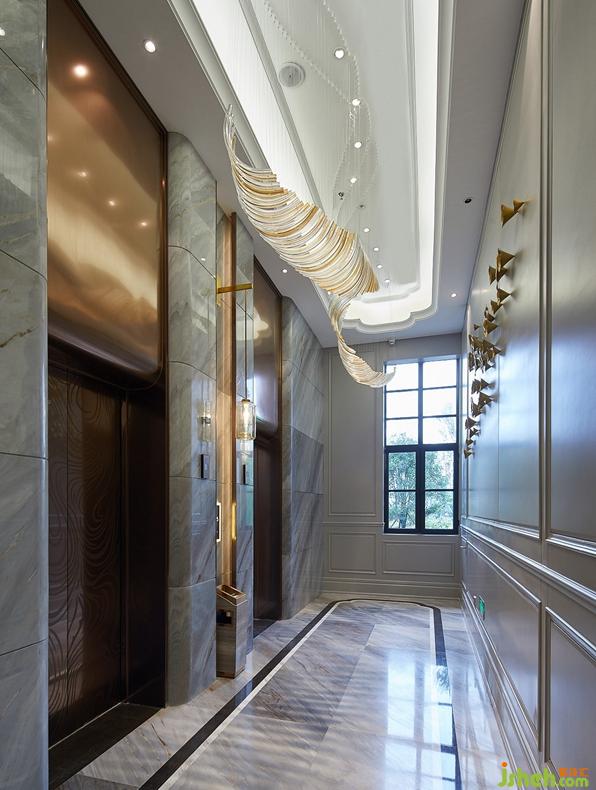 電梯延廊高垂“貝殼”掛飾,增加走廊的視覺延長性,拉伸空間氛圍,使人身臨其境而覺空間通暢,舒心愉快。設(shè)計(jì)公司