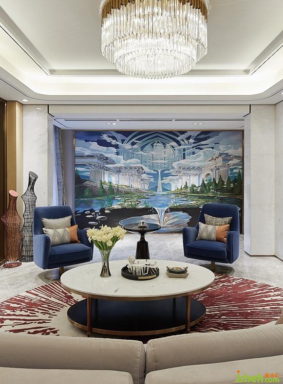 Negative one layer region ACTS as the space role of feasting guests, wine tasting and delight, the whole continues the space color of one layer of sitting room and dining space, the design of earth coffee color is in the main tone, with concise sky blue and gray furniture as the ornament color element, reflecting the atmosphere of the space, more add an elegant and composed temperament. The feather ash that runs through the space will integral design is tonal ably confluence into an organic whole, of the earth temperate contain the nifty of ocean, the fun that adorns the life and quality.