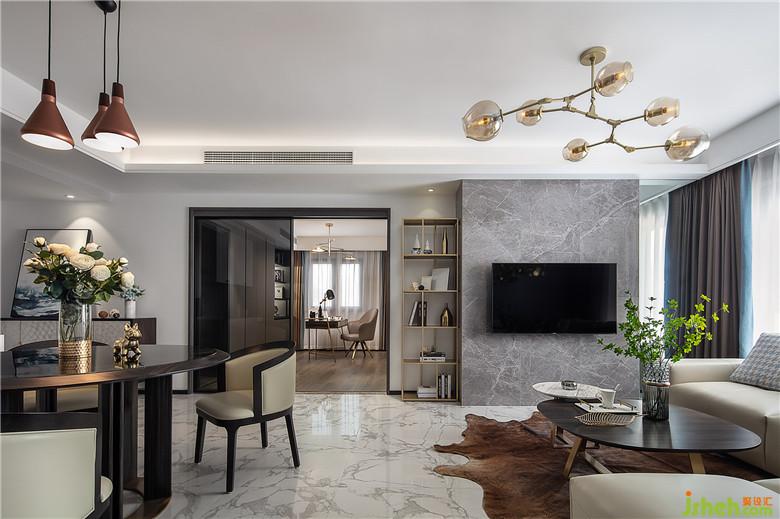 客廳墻面,刷漆壁布的運用,在被賦予了富有肌理的觸感的同時,還回避了后期墻面炸裂的尷尬。非常耐用且易于打理。電視區(qū)域,石材和壁布的搭配。室內(nèi)設計師讓墻面顯得干凈利落且層次有序。