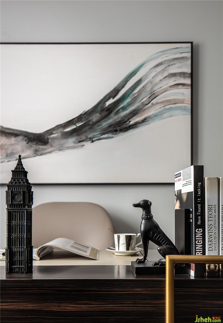 書房里,書桌本身的造型和桌面上的擺設有幾分英國紳士的味道——洗練,復古,還透著幾分時尚。背后大尺寸的掛畫,簡單幾筆構(gòu)成的抽象畫讓書房里多了些飄逸。