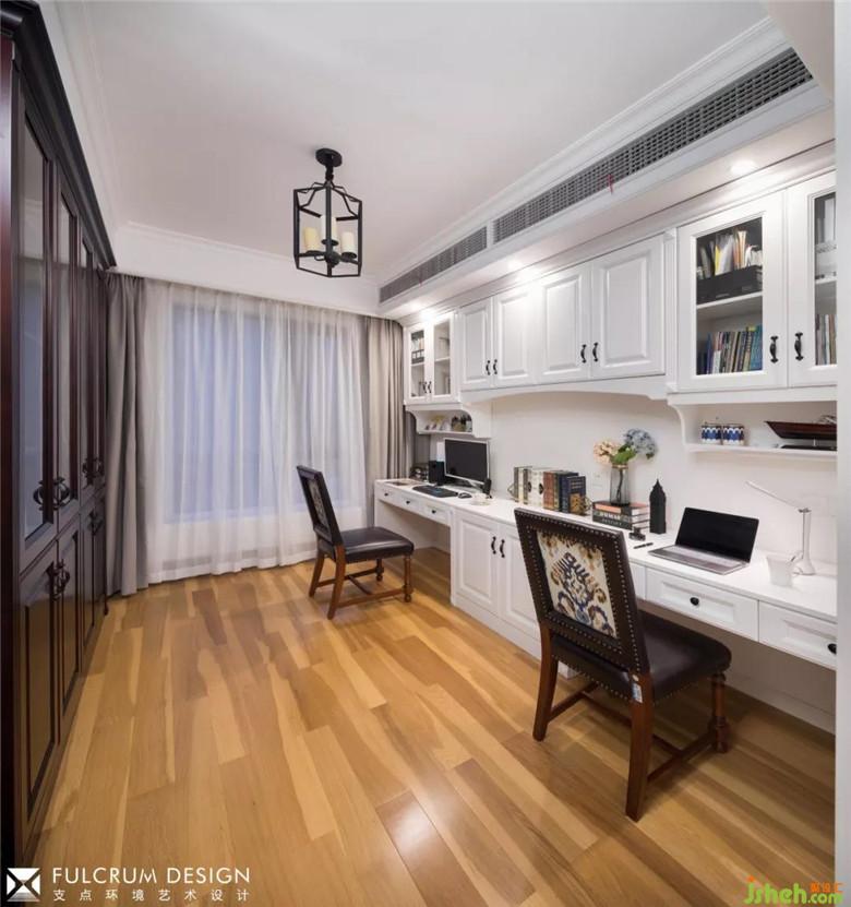 書房不大,但擁有著夸張的超長書桌,為兩人同時(shí)工作提供了奢侈的空間。