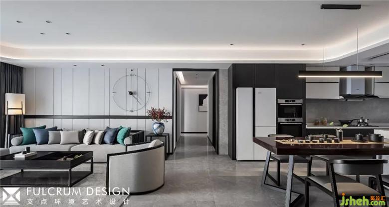 進(jìn)門處衛(wèi)生間門以隱藏門方式處理,和進(jìn)門長(zhǎng)排儲(chǔ)藏柜融為一體。大面積黑色木飾面設(shè)計(jì)讓空間更顯整體性,黑白色的撞色設(shè)計(jì)與餐廳背景設(shè)計(jì)相呼應(yīng),黑白兩種材質(zhì)有節(jié)奏的相互拼湊在一起,裝修公司給空間注入了強(qiáng)烈的現(xiàn)代藝術(shù)感,也映照了我們每日律動(dòng)的生活,讓置身于此的人可以無(wú)負(fù)擔(dān)地遠(yuǎn)離都市喧囂。