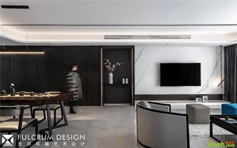 不像普通的客廳那樣簡(jiǎn)單的明亮,本案是利用大面積黑色將空間分域。