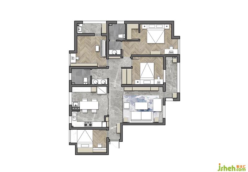 另外,在一些細(xì)部,設(shè)計(jì)師也進(jìn)行了處理,比如多利用客餐廳墻面,“挖”出了多個(gè)柜子架子壁龕,優(yōu)化了原始走道空間,讓原來(lái)的主衛(wèi)也有了干濕分區(qū),讓主臥有了衣帽間,讓兒童房也享受到了更多的光線……