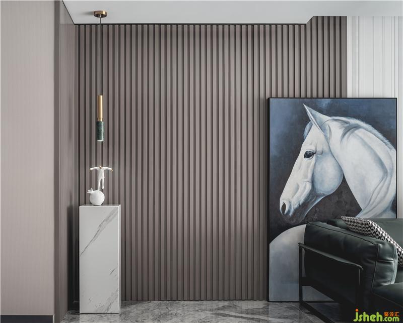 越過玄關(guān)的喧鬧,墨綠和淺灰、真皮和千鳥格、石材或者海浪、所有的質(zhì)感仿佛都凝聚在白馬回眸的那一瞬。在這個空間,任何色彩都融合在場所整體感受中。