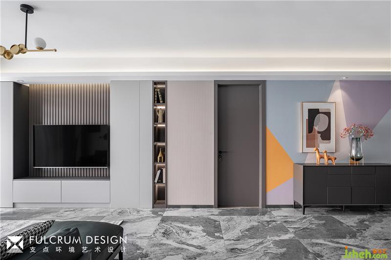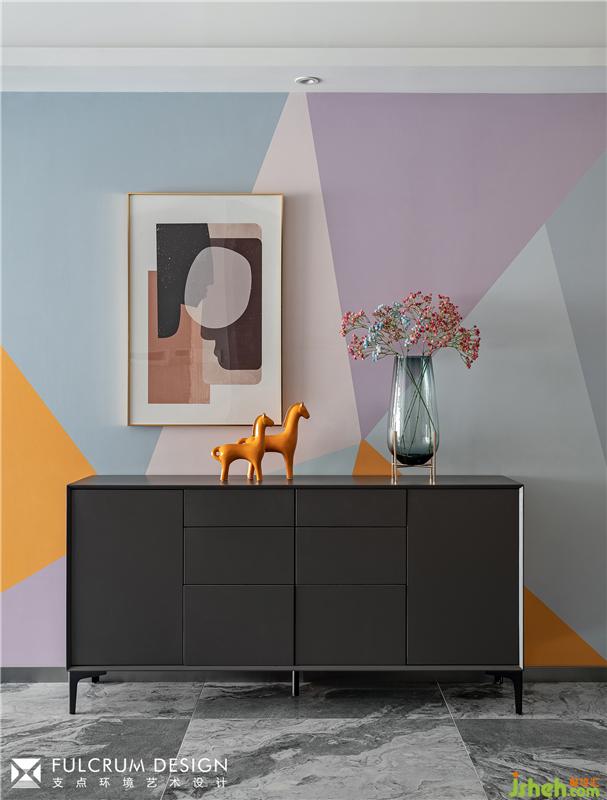 馬的橘色和墻壁的橘色互相呼應(yīng),拼色的壁畫在這個開闊的空間內(nèi)成了。沒有造型的焦點,抽象的充滿愛意的裝飾畫能很好的柔化幾何線條產(chǎn)生的割裂感。紅藍相間的滿天星能讓主人感受到回家的熱情。