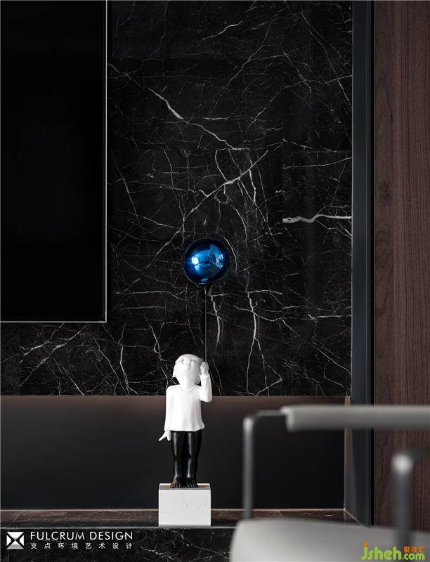深色山文木飾面與黑色亮面石材的肌理對(duì)比,走廊處遠(yuǎn)景的黑白對(duì)比,顯得整個(gè)3樓層次感非常豐富。