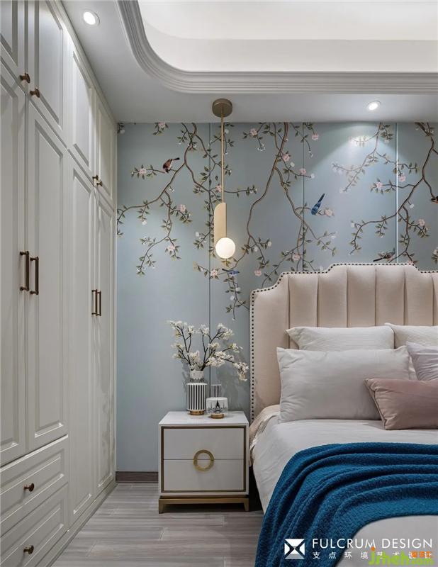 年齡越大的人,越喜歡豐盈、喜慶的東西,設(shè)計(jì)師采用以小見大的手法,家居裝修利用軟裝勾勒一幅“春日花鳥圖”,營造喜悅意境。墻面硬包上的樹枝蜿蜒搖曳、錯(cuò)落有致,床頭柜上的白色海棠花延伸硬包花紋、盛開出來,鳥兒姿態(tài)生動(dòng),場(chǎng)景豐富活潑。