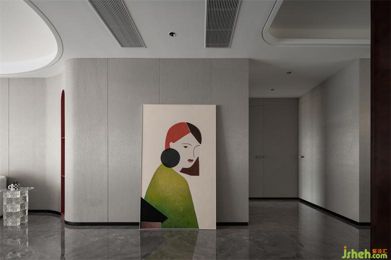 灰色原本是把一切色彩雜糅后的平淡,但畫面右邊的硬包泛著流光,呈現(xiàn)線性肌理,左邊的藝術(shù)漆則如云朵,呈絮狀蔓延,家裝設(shè)計(jì)使這個(gè)家中既有坦然以對的平和,又蘊(yùn)藏著一種直面人生的力量。