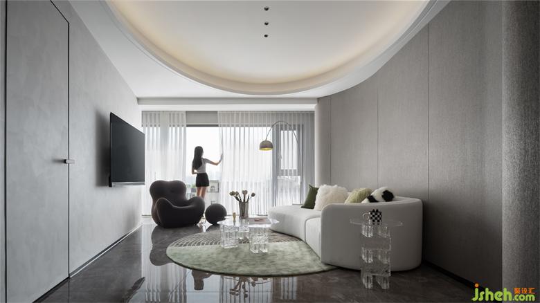 沙發(fā)旋轉(zhuǎn)30°,居者在家中可直面江景,「喇叭形」的客廳布局順勢而生,延展客廳視距的同時(shí)仍保留了南向次臥室的衣柜長度。