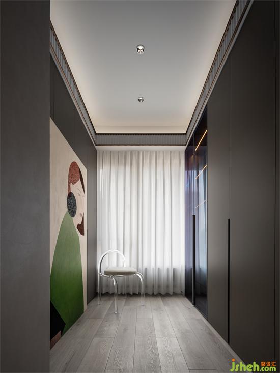 每個(gè)女生都需要一個(gè)衣帽間,考慮到業(yè)主的衣物類型,玻璃柜門穿插其中,便于業(yè)主欣賞自己心愛的包包。