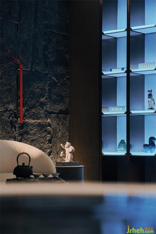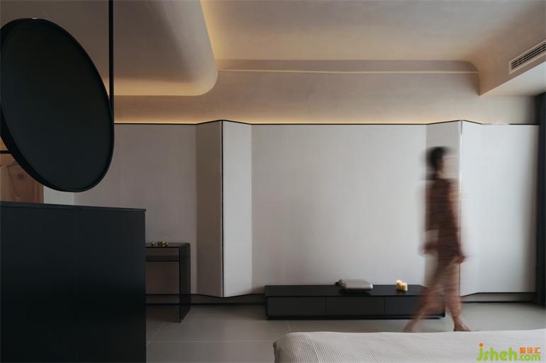 日落的鐘聲已然響起,昏黃的光線悄然充盈在屋子里的細處角落,深色的石材在默默告知黑夜即將到來,酒店設計折疊的墻體暗喻遠處起伏的潮汐,空間里素雅無尚的器物變得愈加溫潤,漂浮著的潺潺水聲營造出脫離于現(xiàn)實、照入夢想的情景。