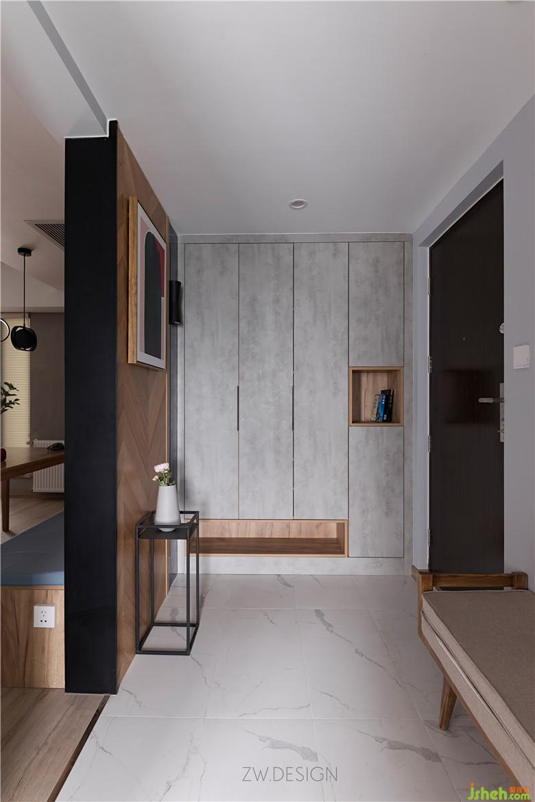 白色大理石地面+水泥灰質(zhì)感的玄關收納柜+木作的搭配,高級干凈簡單又不失溫暖。條凳的存在,填補了玄關的單調(diào),舒適的軟墊讓脫換鞋也變成了一種享受。