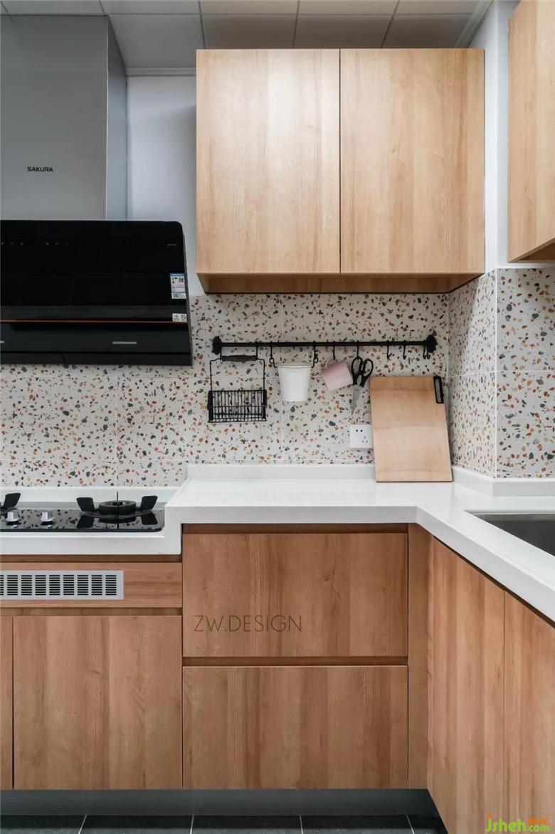 瓷磚貼了半墻,水磨石點綴單調(diào)的墻面。