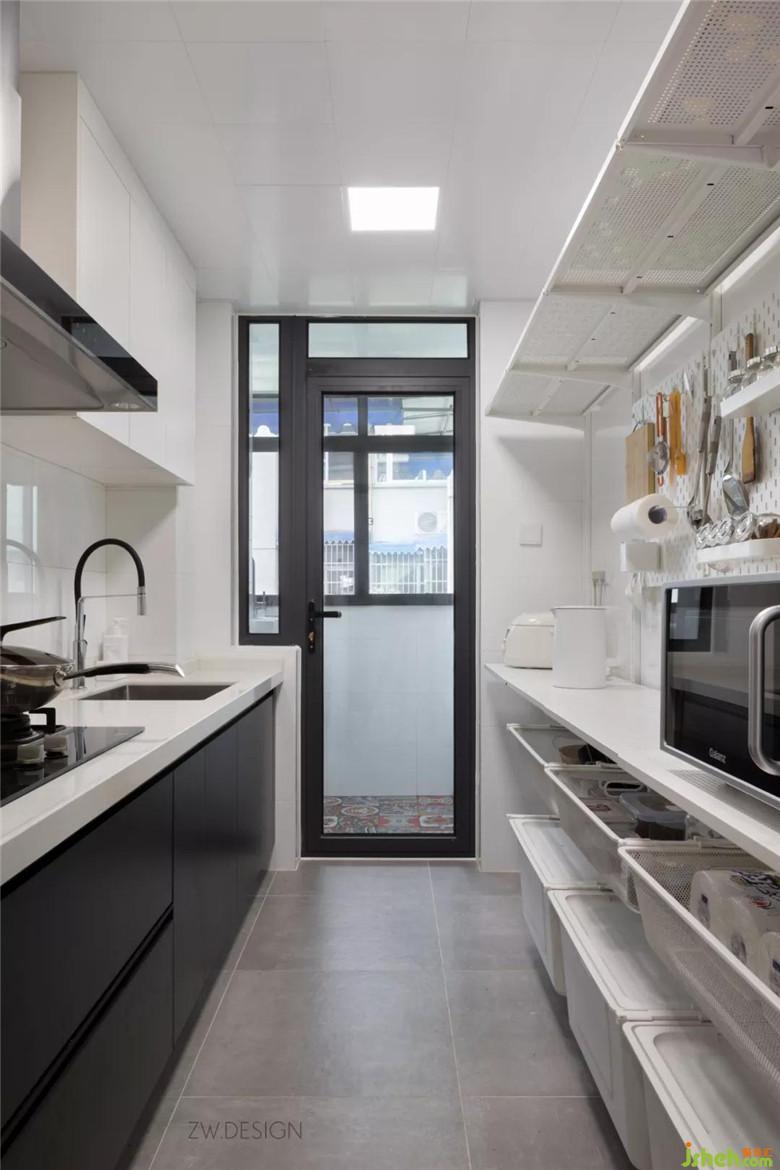 通過門洞位移,將動線往櫥柜一側(cè)移動,釋放出原本浪費的一側(cè)墻面空間,利用這個空間設(shè)計了宜家的艾格特(ALGOT)貨架,補充了廚房操作臺面的同時,增加了巨量的收納空間。相對兩側(cè)櫥柜的設(shè)計,艾格特有更好的靈活性、實用性和更高的性價比。次臥壁櫥也采用了艾格特貨架,屋主準(zhǔn)備之后次臥先用來養(yǎng)狗狗,所以暫時空閑沒有拍照。廚房和生活陽臺墻面都采用了純白色瓷磚,盡可能多的將自然光線引入室內(nèi)。致物設(shè)計