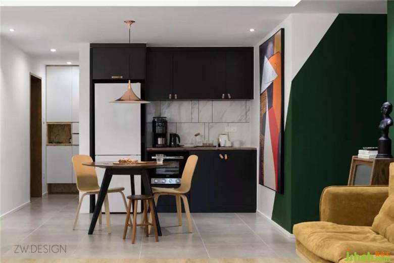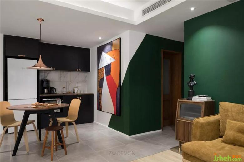 通過地面材質(zhì)的區(qū)分,把通道的面積也劃給了餐廳,餐廳顯得大了許多。在墻體陽角做了斜切的分色,與巨幅抽象畫相得益彰,墨綠色乳膠漆與抽象畫的搭配帶來強烈視覺沖擊。