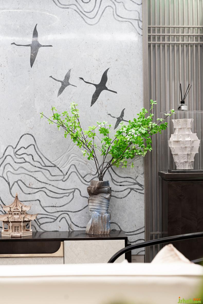 樣板房設計長輩房灰調性巨幅春意山水背景,還原心境最初的底色。儒雅的搭配和布置,體現出文化特質