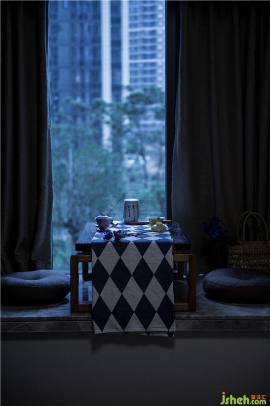 一側(cè)飄窗安置茶座,茶香書香為伴。