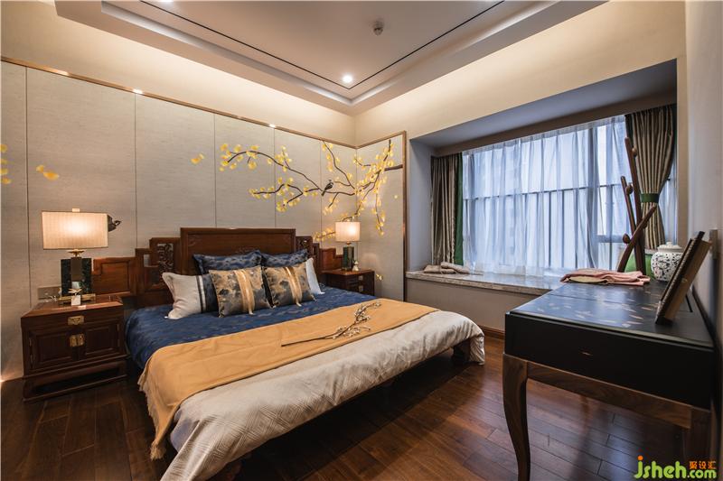 “疏影橫斜水清淺,暗香浮動月黃昏”。 主臥極具東方文化內涵的梅花與元素,圓月梅花,滿載祝福之意。中式屏風的背景墻搭配造型古樸的木床,營造采菊東籬的中式田園的閑淡意境。室內設計師