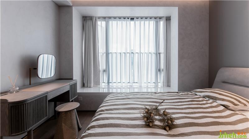 進入主臥室,天花及壁面維持統(tǒng)一的干凈質(zhì)感,通過灰棕色系烘托溫馨氛圍。