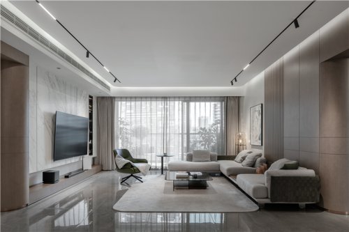 客廳的天花板對應地面,運用木飾面進行區(qū)域分割。入戶的屏風設計讓歸家的主人得到緩沖放松,從而開啟舒適的居家時光。