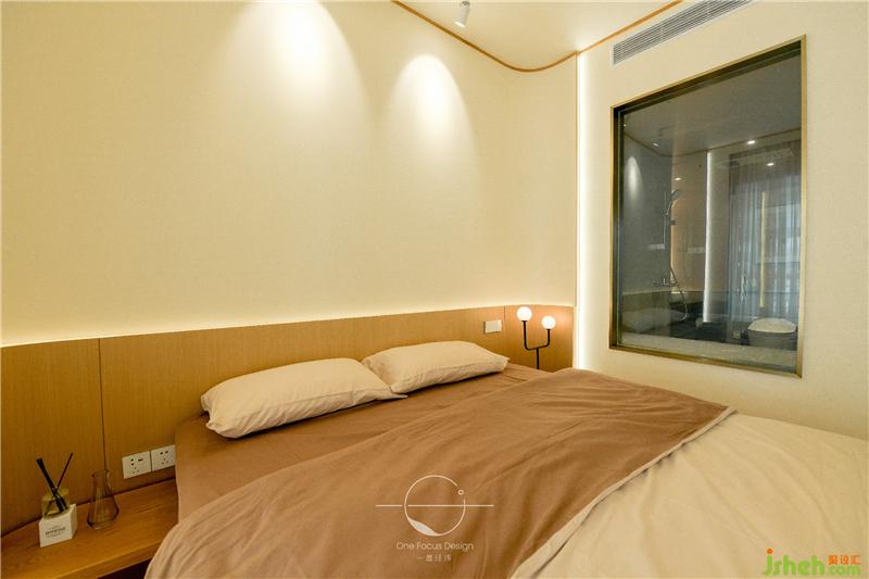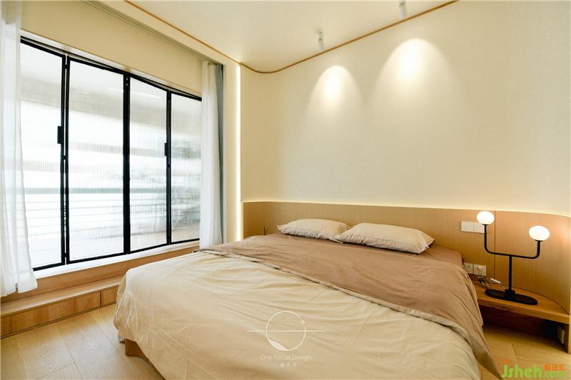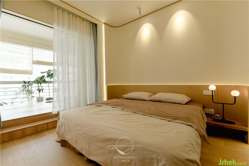 主臥與陽(yáng)臺(tái)相連,引景入室,紗簾和透明玻璃門若隱若現(xiàn)的阻隔讓空間氛圍變得自然而寧?kù)o,禪韻十足。臥室里內(nèi)嵌線條燈,在細(xì)節(jié)處勾勒出主人雅致的生活方式。