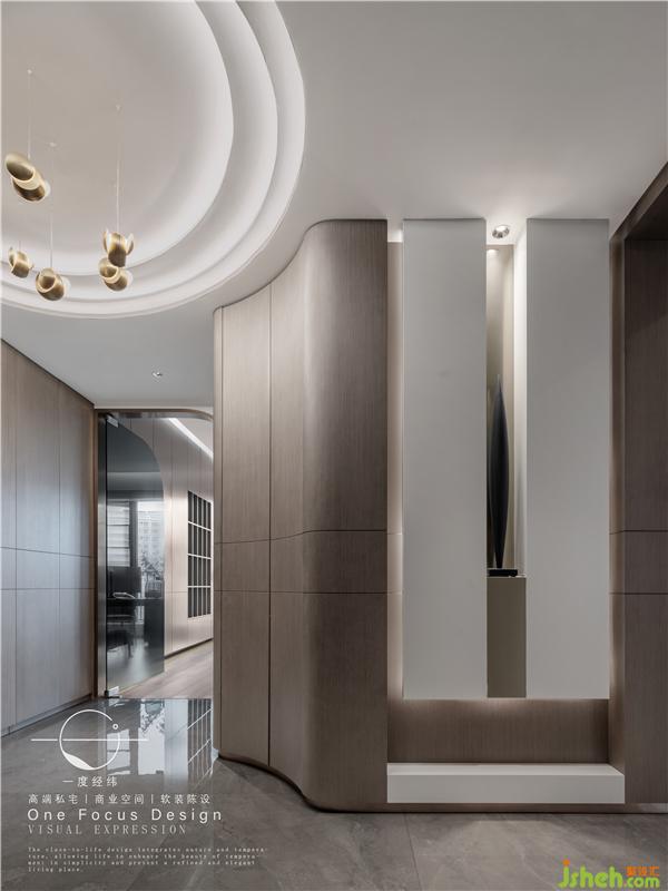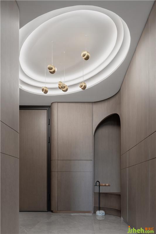 弧形的設(shè)計(jì)能在視覺上擴(kuò)大空間的范圍。利用弧形的設(shè)計(jì),在玄關(guān)處設(shè)置了內(nèi)嵌式換鞋凳鞋柜?;⌒蔚拈T洞設(shè)計(jì),就像是家與外界的隔絕。脫下在外的疲憊,換上家庭的輕松,享受家的愜意。