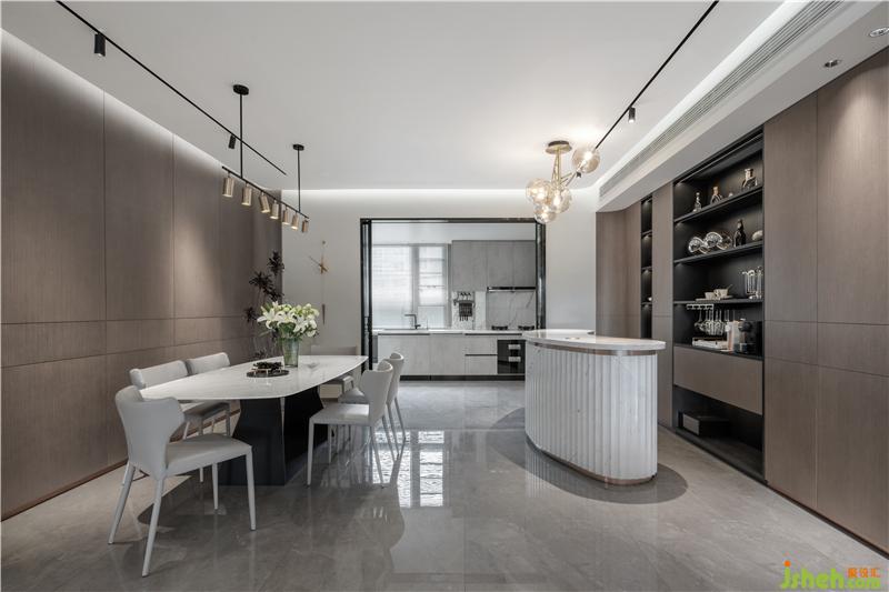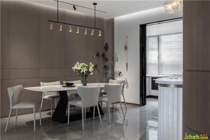 開放式的餐廚空間用內(nèi)嵌式玻璃門隔開,將生活的煙火潛藏,而此刻,玻璃不再是單一的表現(xiàn)形式,而是空間的存在與連接的關(guān)鍵。