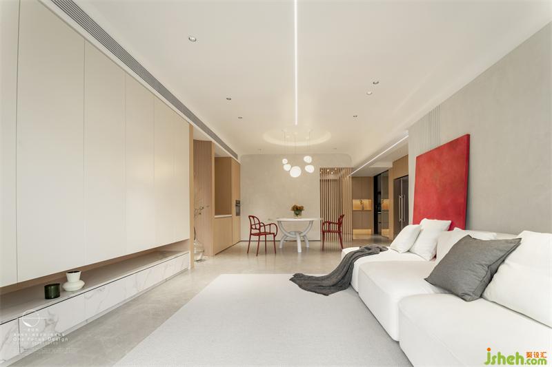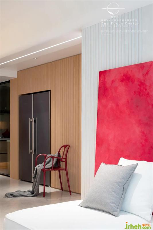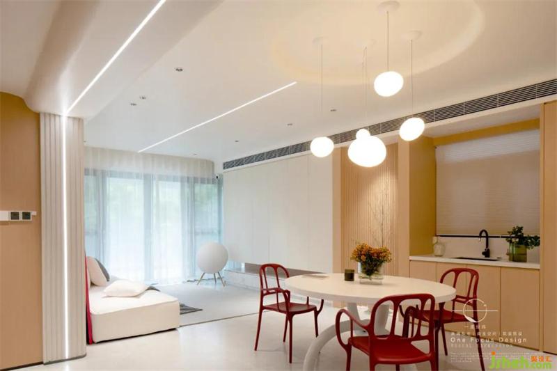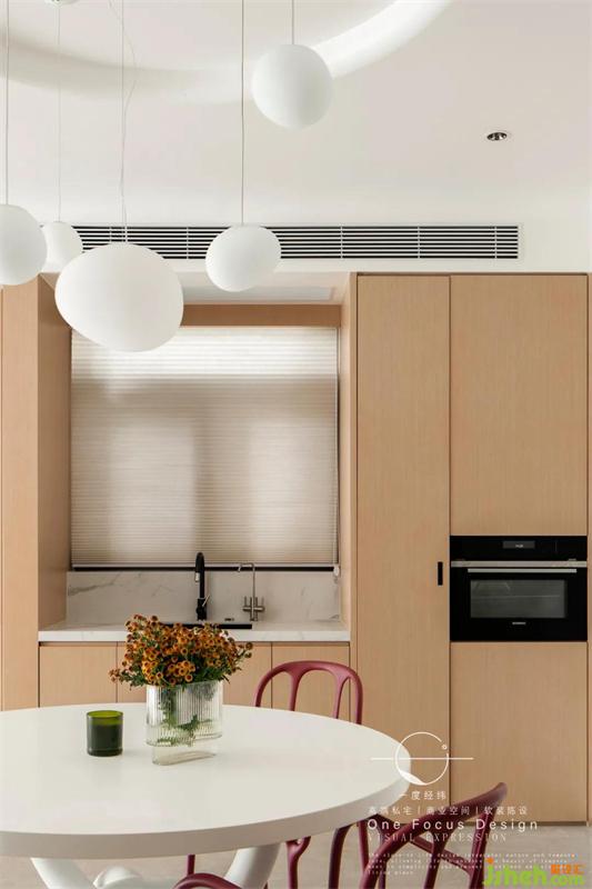 白色的餐桌、復(fù)古紅色的餐椅、橢圓造型的吊燈,簡單閑適,令人對每日三餐的美好盛筵新生向往。
