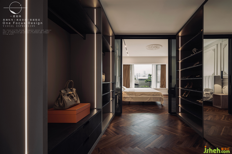 琳瑯滿目的包包與鞋物,那是多少女生夢幻的衣帽間!線性的燈光整齊規(guī)律,炫酷而夢幻的儲物空間,設(shè)計師不僅把控整體美學(xué)的視覺感官,也強調(diào)了家具到物品飾品等品質(zhì),為人的感官視覺體驗與居住舒適度打磨精細化細節(jié)。