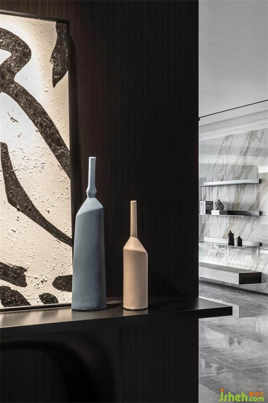 會(huì)客廳分為書法臺、會(huì)客區(qū)、品酒區(qū)和品茶區(qū)。書法臺采用黑棕灰紅四色搭配,木飾面的深沉、金屬的堅(jiān)毅和皮革布料的柔軟,形成了強(qiáng)烈的視覺感受。