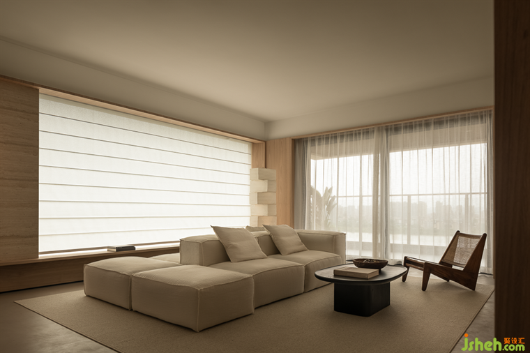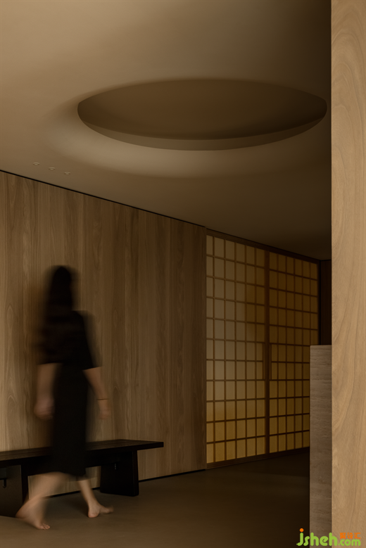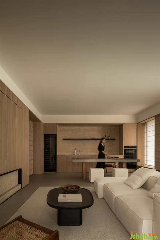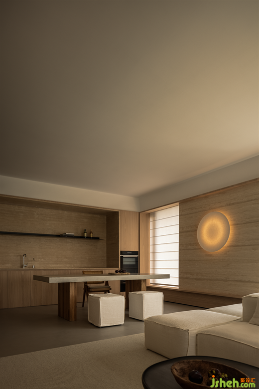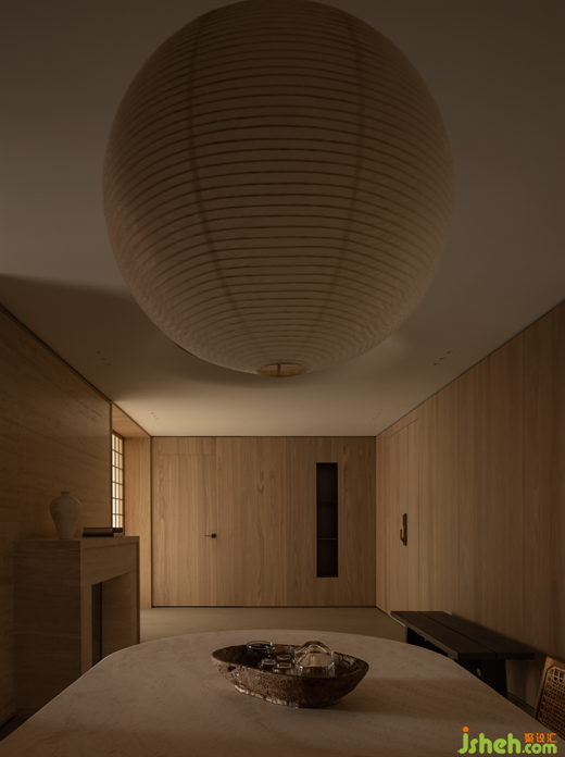 藏而通達,隱有乾坤。從玄關進入前廳,是一個聚合與流轉區(qū):私宅設計暗色木質條凳與淺色石紋壁爐形成與餐廳融合的第二玄關,新風與照明功能隱于天花圓頂之中,開合之間自由聯(lián)通廚房、客廳、臥室。動靜虛實,思深言淺,以至平和。