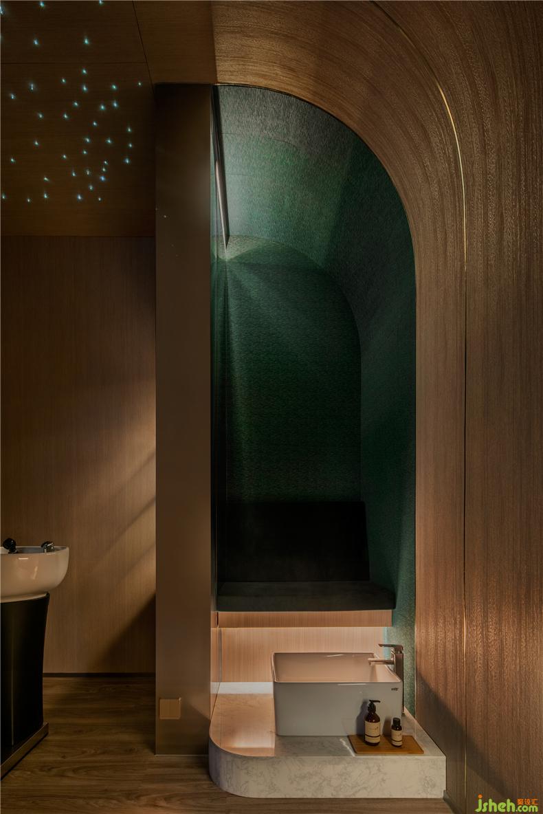 設(shè)計(jì)師堅(jiān)信愉快的消費(fèi)體驗(yàn)來自無微不至的細(xì)節(jié):咨詢室以列車餐車為設(shè)計(jì)靈感,如同兩三摯友暢談聊天,打破了零售空間中常見的買賣對(duì)立的關(guān)系,其中氛圍,好似列車經(jīng)過隧道,車廂亮著壁燈的溫暖場(chǎng)景;而展示產(chǎn)品的壁龕,也以列車中餐車的形式展現(xiàn)。進(jìn)入護(hù)理區(qū)域,浴足座位再現(xiàn)軟臥包廂的感覺,天花則處理成半弧形,當(dāng)客人護(hù)理時(shí),躺臥于沙發(fā)座椅上,室內(nèi)設(shè)計(jì)師視線接觸比較多的天花,所見是若明若暗的星空。