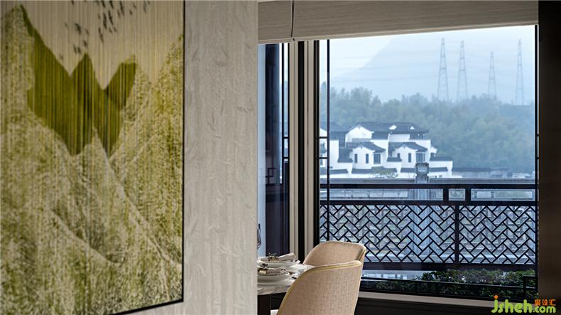 客廳中青山藝術(shù)畫充分表達平靜自在的心境,“峽里誰知有人事,世中遙望空云山?!睆目蛷d的落地窗向遠處眺望,天空澄碧、纖云不染,遠山含黛、和風(fēng)送暖。畫與景融為一體、美輪美奐。