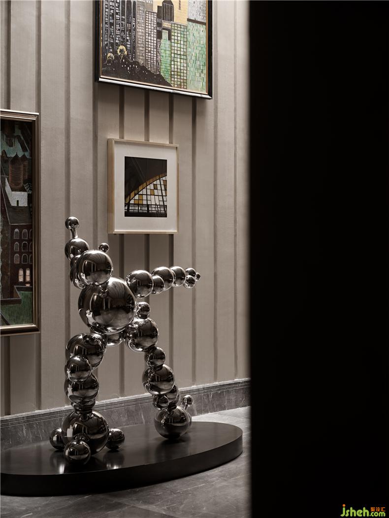 所以本案在設(shè)計(jì)中WED中熙設(shè)計(jì)還原了別墅主人豐富的精神世界,大量的藝術(shù)作品、別墅裝飾爵士音樂(lè)主題房間、剛剛傳入中國(guó)的網(wǎng)球運(yùn)動(dòng),以及豐富的收藏……