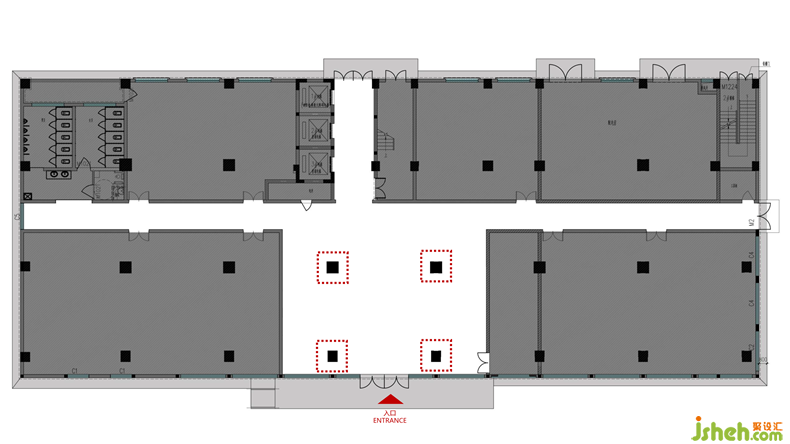 在空間布局上,WED中熙設計對原來上下兩層的大堂建筑空間的結構進行重新設計,對人流動線也重新規(guī)劃。原有空間中大堂中四根立柱孤立存在,連接橫梁阻礙視線破壞空間整體感,與外立面也毫無聯(lián)系,辦公室設計設計師重新調整了幾者的關系,把四根柱子鏈接做成整體的構筑物,也創(chuàng)造出人員行走和等待的不同動線。