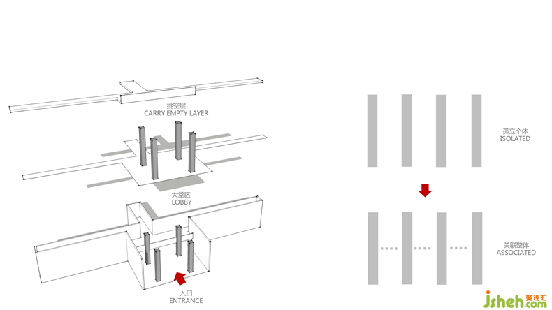 In terms of space layout, WED redesigned the structure of the original lobby building space on the upper and lower floors, and re-planned the circulation of people. In the original space, the four pillars in the lobby exist in isolation. The connecting beams obstruct vision and destroy the overall sense of the space. They have no connection with the exterior fa?ade neither. The designer re-adjusted the relationship between four pillars and made them as a whole structure. It also created different circulations of people walking and waiting.