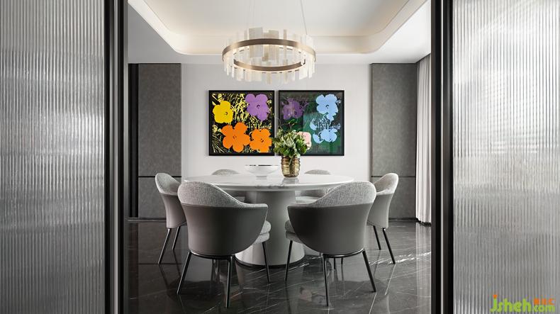 隨處可見藝術(shù)品的痕跡,拉開玻璃隔斷,映入眼簾的是餐廳里掛的波普教父Andy Warhol的經(jīng)典作品《Flowers》,Andy Warhol用波普藝術(shù)絲網(wǎng)印刷手法通過花系列描繪出一個(gè)時(shí)代,在時(shí)代流轉(zhuǎn)設(shè)計(jì)交融中給空間帶來永恒經(jīng)典的意味,帶來更多對美的體驗(yàn)和向往。