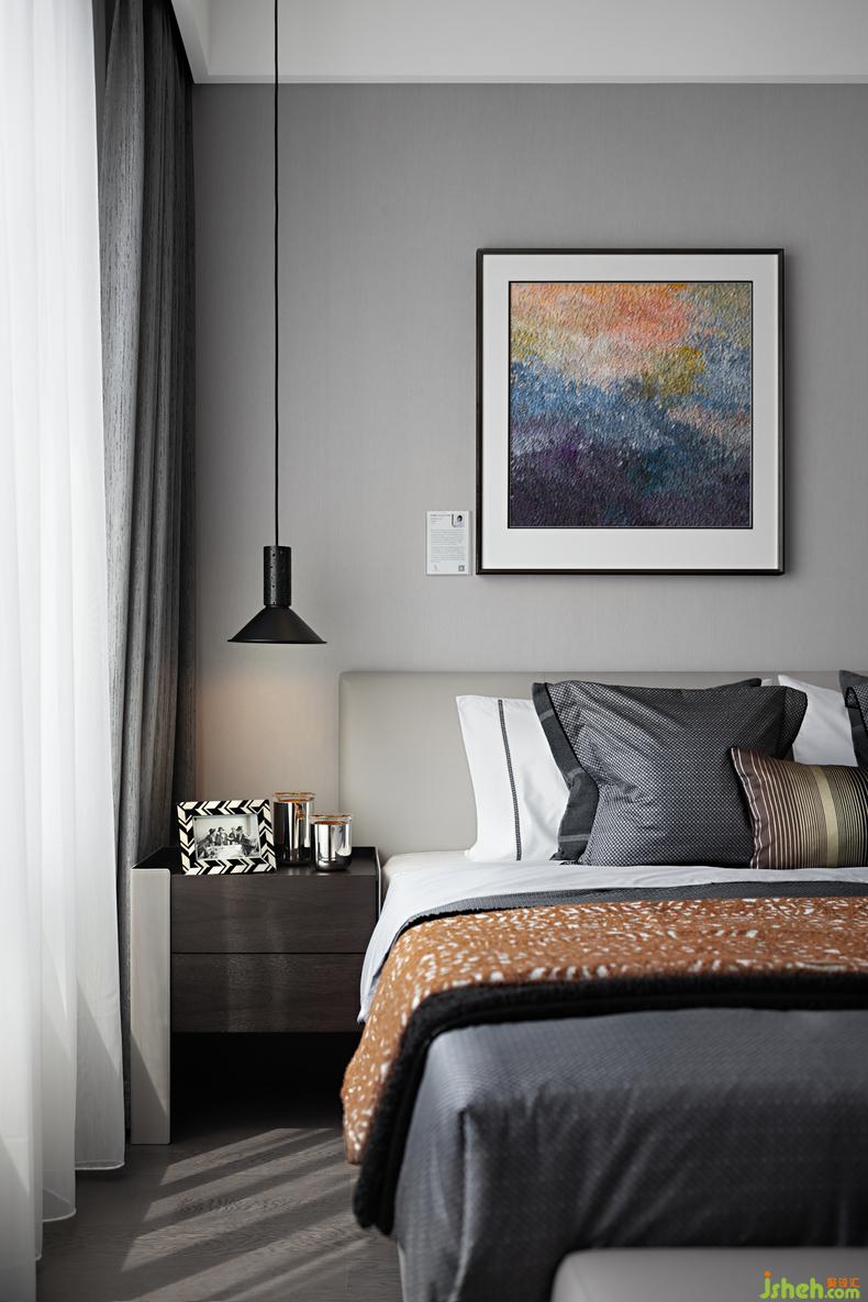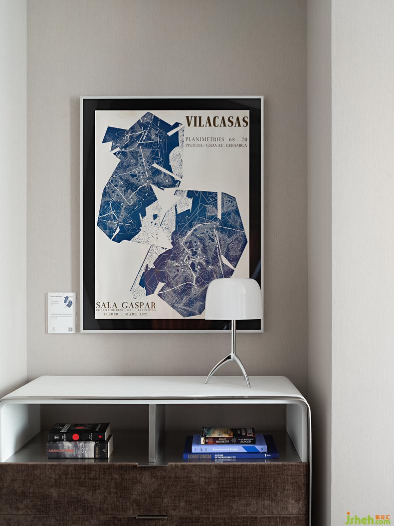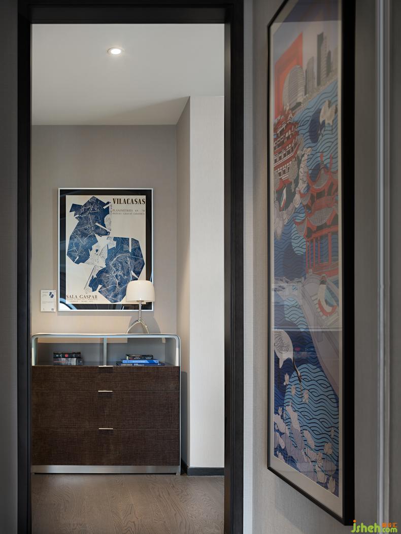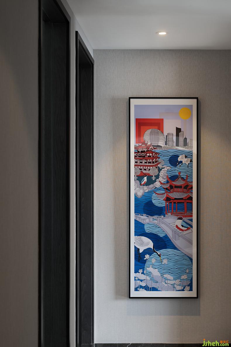 走廊盡頭處特意選擇英國藝術(shù)家Rob Pepper的《A Portrait of Hangzhou杭州印象》,以獨特的視角,大膽、優(yōu)雅的筆觸呈現(xiàn)一個獨一無二的杭州印象。臥室則是中國藝術(shù)家田丹露的《曙色遠連山色起》,樣板房設(shè)計以幻點色彩的藝術(shù)手法詮釋一個霧雨朦朧的感覺空間,感受空間中帶來的平和寧靜與治愈身心時的沉醉。