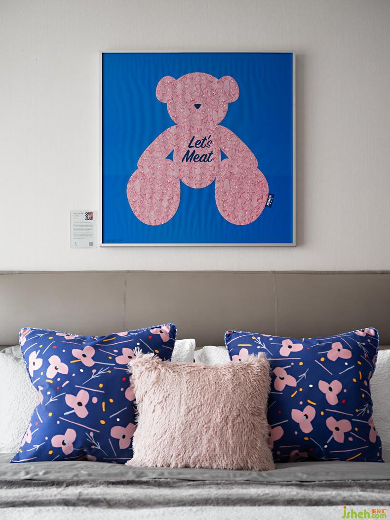 設(shè)計師為女兒房精心搭配了潮流藝術(shù)家葉子樂的《Let’s Meat Bear 》,別具一格的視覺語言和濃烈色彩的鋪排與沖撞營造女孩空間特有的明快爛漫。