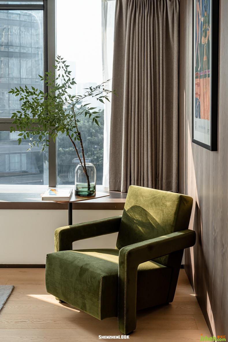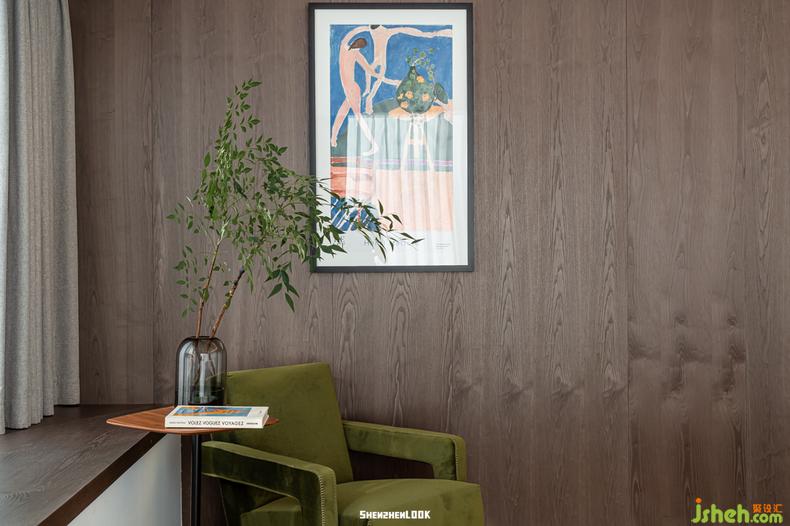 來(lái)自馬蒂斯博物館的海報(bào)與私人定制的祖母綠單人沙發(fā)相互作用生成和諧的生活場(chǎng),豪宅設(shè)計(jì)打破主臥大面積木質(zhì)墻面的秩序感,這種富有韻律感的生活美學(xué)與李先生追求的生活狀態(tài)無(wú)比契合。