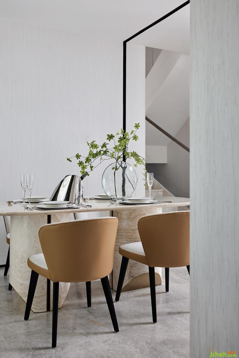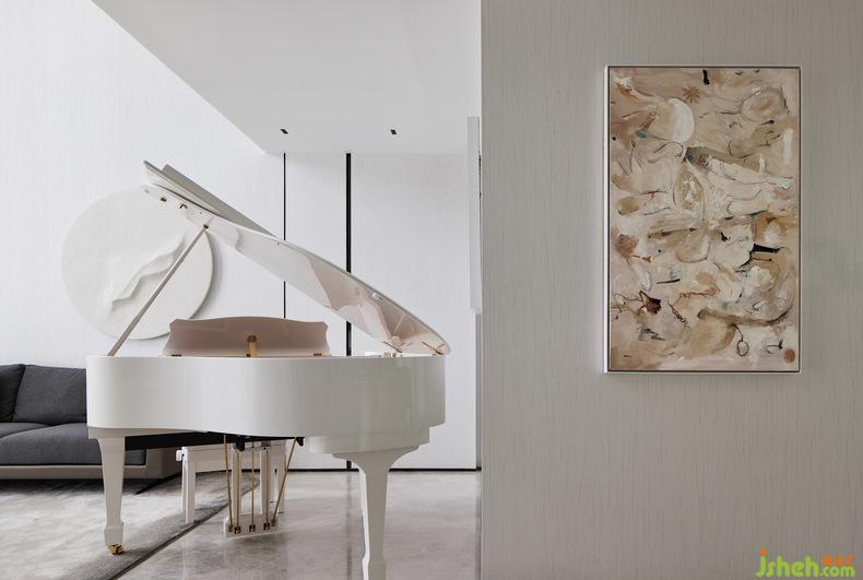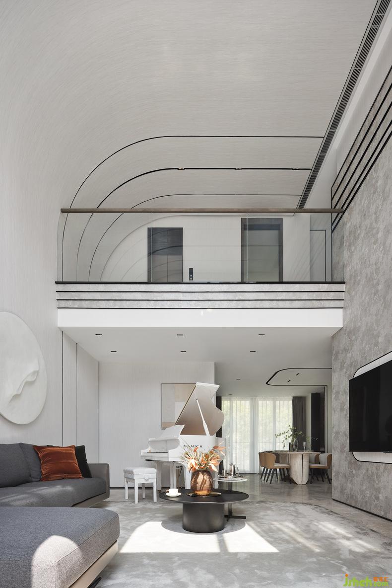 在整個(gè)客廳挑空的空間,隨著線條伸展的方向,空間力量乍現(xiàn),別墅設(shè)計(jì)空間感與節(jié)奏感不言而喻。從二層到一層傾瀉而下的整面落地玻璃將自然光引入,再經(jīng)過(guò)室內(nèi)中三角琴帶來(lái)的悠揚(yáng)奏鳴曲,氛圍被重構(gòu),讓藏在光影變化和相互作用中的歡快與跳躍感幻化出不同的畫境,同時(shí)增加了整個(gè)房子的藝術(shù)氣息。