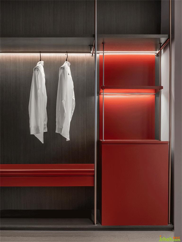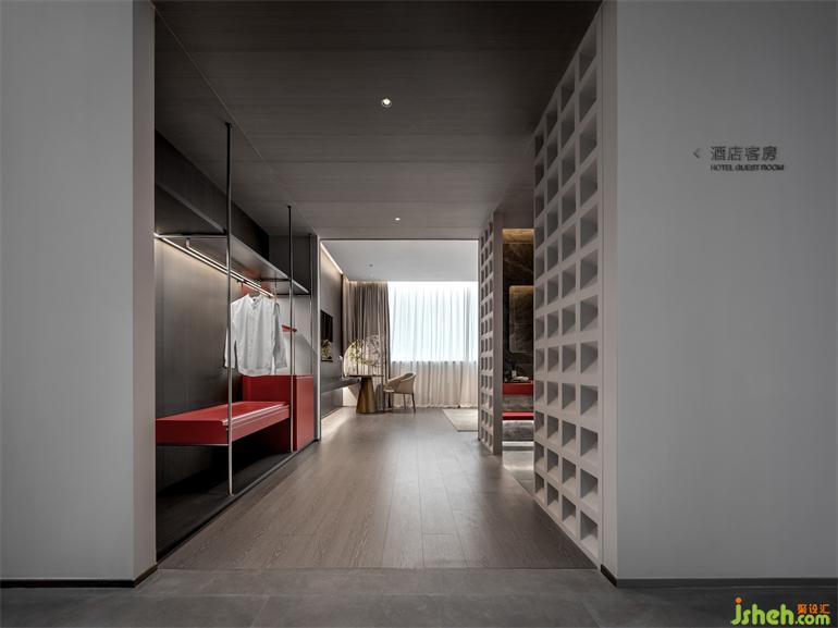 設(shè)計(jì)師強(qiáng)調(diào)智能照明賦予精品酒店場(chǎng)景的便捷及舒適性,在天花造型、專(zhuān)賣(mài)店設(shè)計(jì)床沿底部、床頭桌底部、洗手臺(tái)底部、衣柜隔層等各局部細(xì)節(jié)中增添間接照明,映襯產(chǎn)品的精良工藝。借由藝術(shù)與功能的平衡,床頭垂墜的藝術(shù)吊燈,在正紅色床頭板的映襯下,更顯意境氤氳。