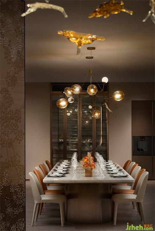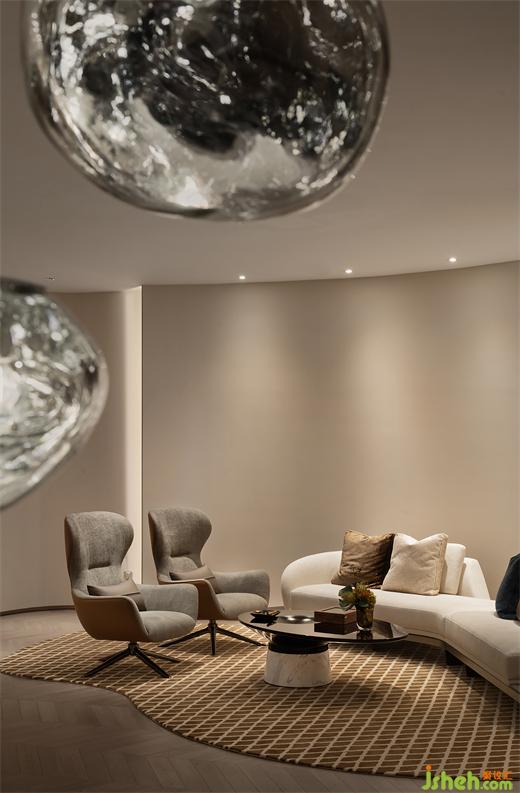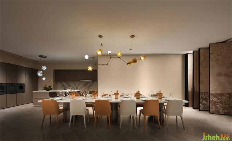 生活是藝術生長的養(yǎng)料,而空間是生活方式的場景化。繞至宴會廳后側,九廬NOVE CLUB會所設計在造型與設色的形式表達上,設計師有意通過一定的留白與燈光烘托下的明暗關系,營造舒適閑雅的人文體驗。時光流轉間,從容自如的狀態(tài)貫融整個空間,最終落點于圈層認同下的場域共鳴感。