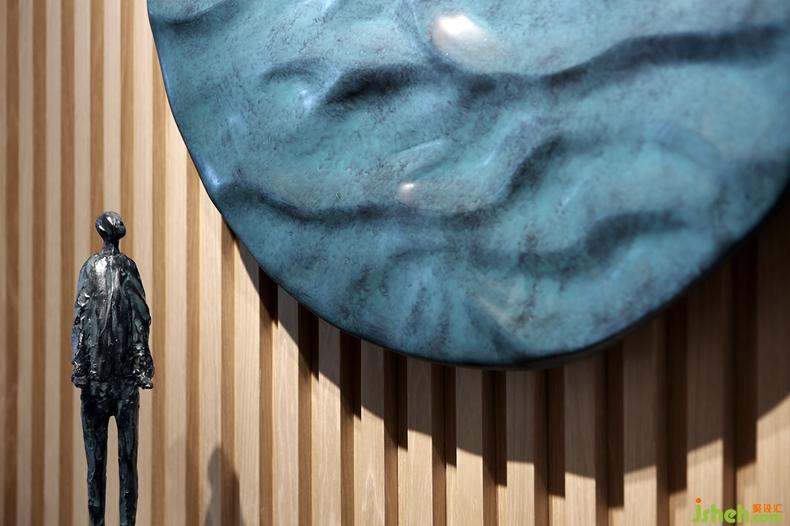 初入空間,映入眼簾的是一組名為“觀?!钡乃囆g(shù)品,從案臺上銅人雕塑角度看過去,掛畫在燈光照射下“波光粼粼”。