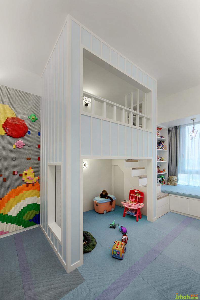 運(yùn)用了小復(fù)式的結(jié)構(gòu),讓兒童房呈現(xiàn)一個(gè)童趣盎然的奇妙世界,滿足萌動(dòng)童心。既有樂高墻,又有凸窗部分的閱讀區(qū),運(yùn)用這些不同的功能區(qū)間,培養(yǎng)兒童的想象力和創(chuàng)造力,探索新世界。