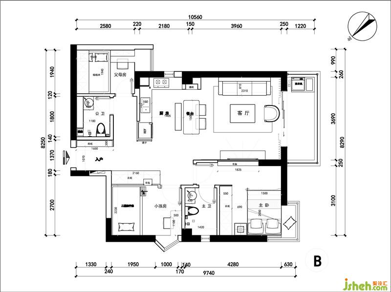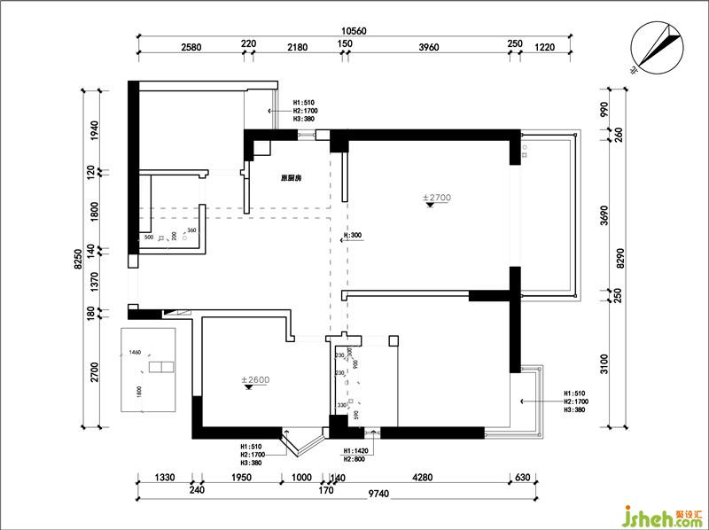 原結(jié)構(gòu):廚房空間較小,收納有限,餐廳位置小,動線略憋屈,線面不夠規(guī)整,客廳空間感不足。客廳吊頂天花裝飾略顯瑣碎,并將整體層高壓低。 房間利用率較低,現(xiàn)有功能不足。 左下角房間的衣儲在室內(nèi)不便打開。室內(nèi)設(shè)計師