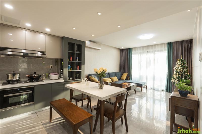 客餐廳整體空間線條干凈、利落,簡約的實木家具帶來溫潤感,創(chuàng)造出空間輕松、舒適的氛圍,以藍(lán)色系坐墊和明黃裝飾物點(diǎn)綴,令原本的淺棕墻與簡單的木質(zhì)家具擁有了靈動的氣質(zhì)。地面簡潔處理,天面墻面地面色彩層次分明而協(xié)調(diào)。櫥柜臺面和儲柜臺面同一材質(zhì),簡潔協(xié)調(diào)。酒柜和櫥柜一體設(shè)計,這是小空間有溫度的創(chuàng)意,增加了功能和美感。酒柜邊緣設(shè)置了一定寬度的邊框,這樣顯得更有層次。側(cè)面邊框設(shè)置小隔層,剛好可以放調(diào)味。這些細(xì)節(jié)都增加了使用價值和同時也增加了美感。室內(nèi)設(shè)計師